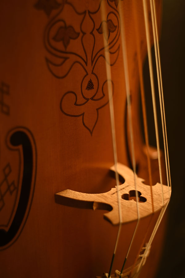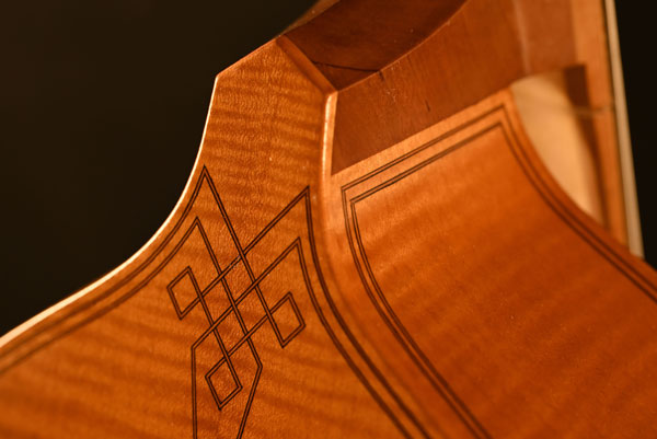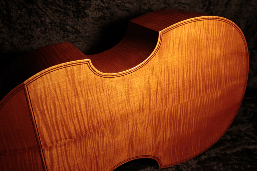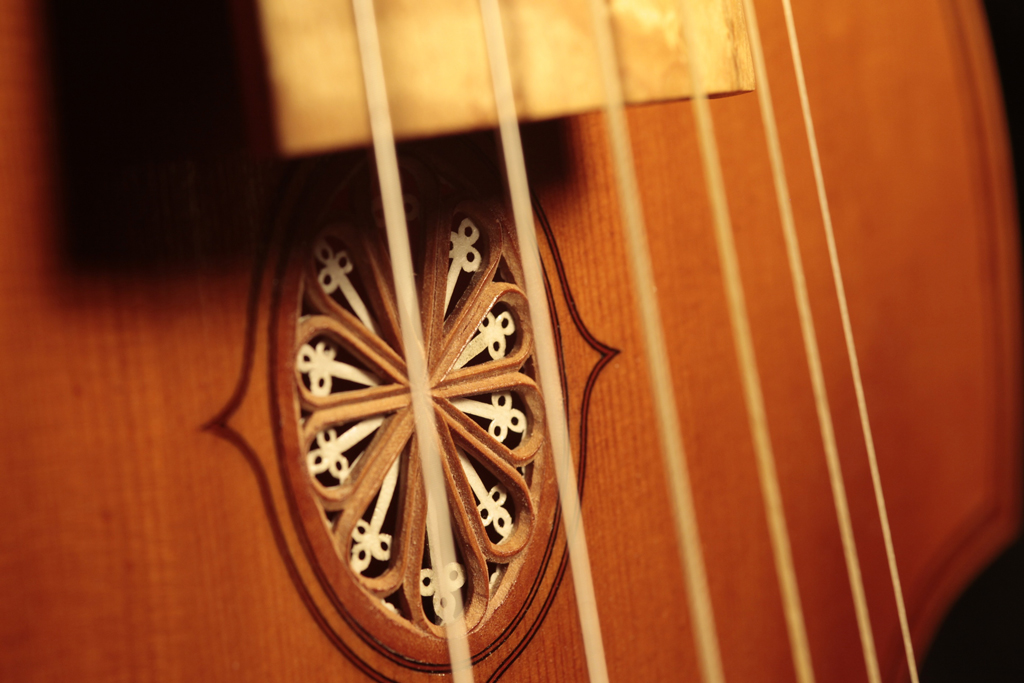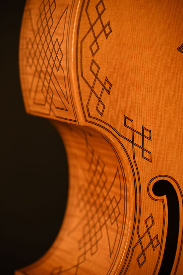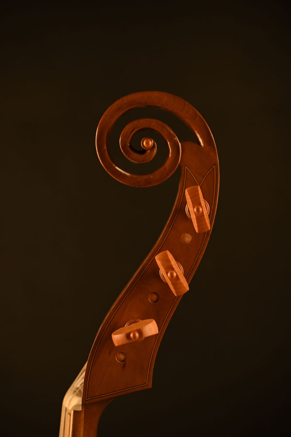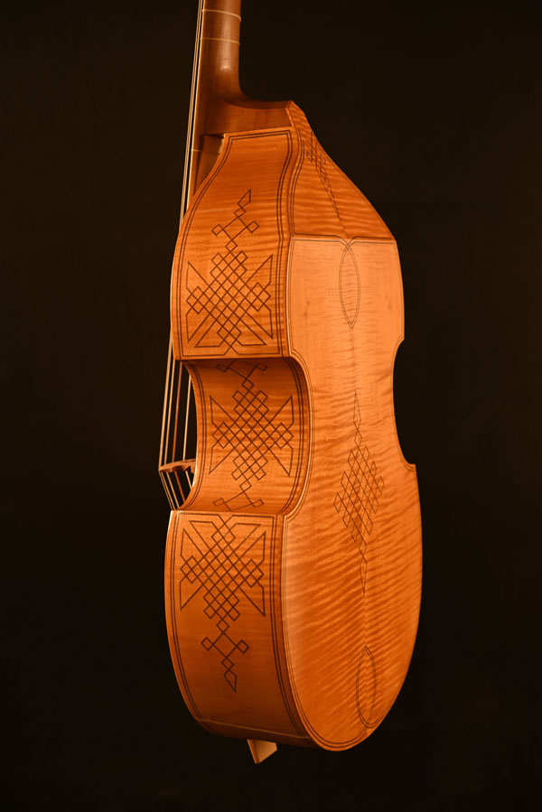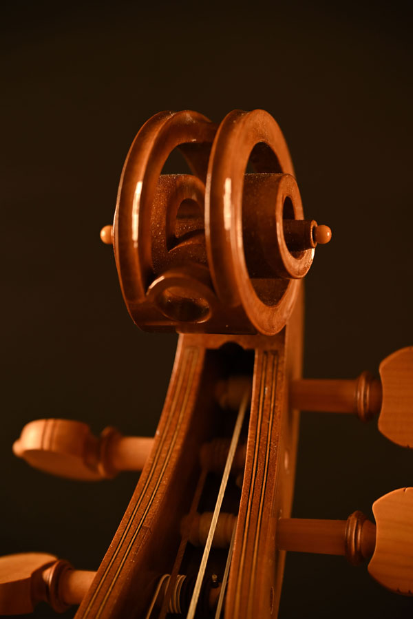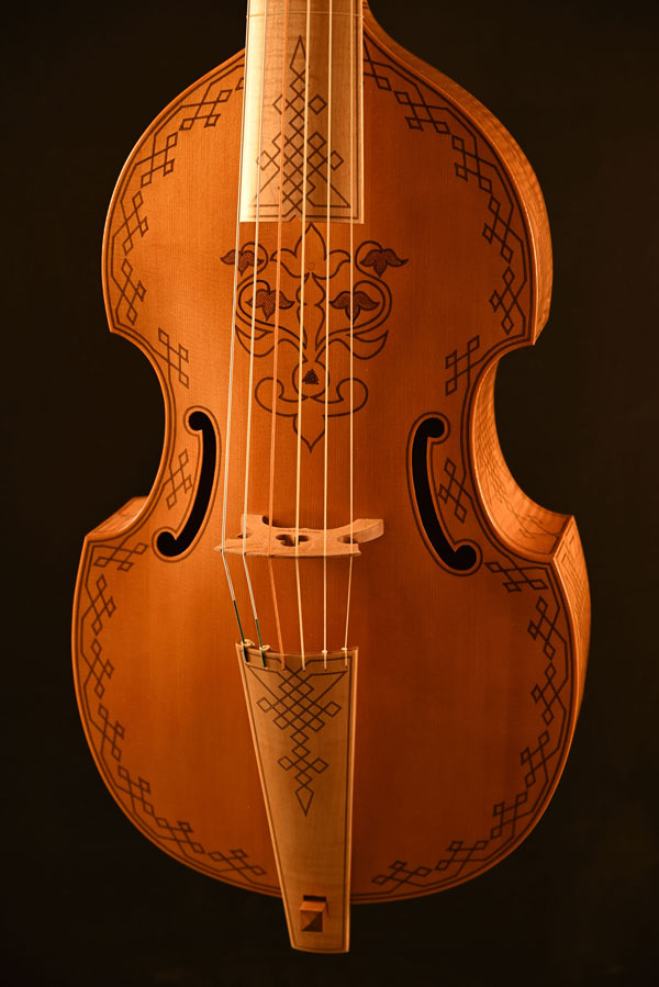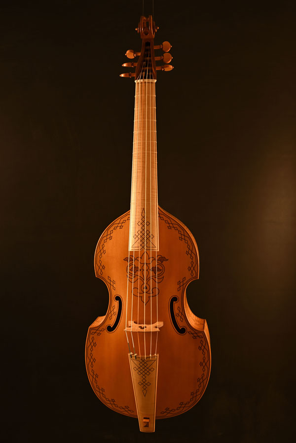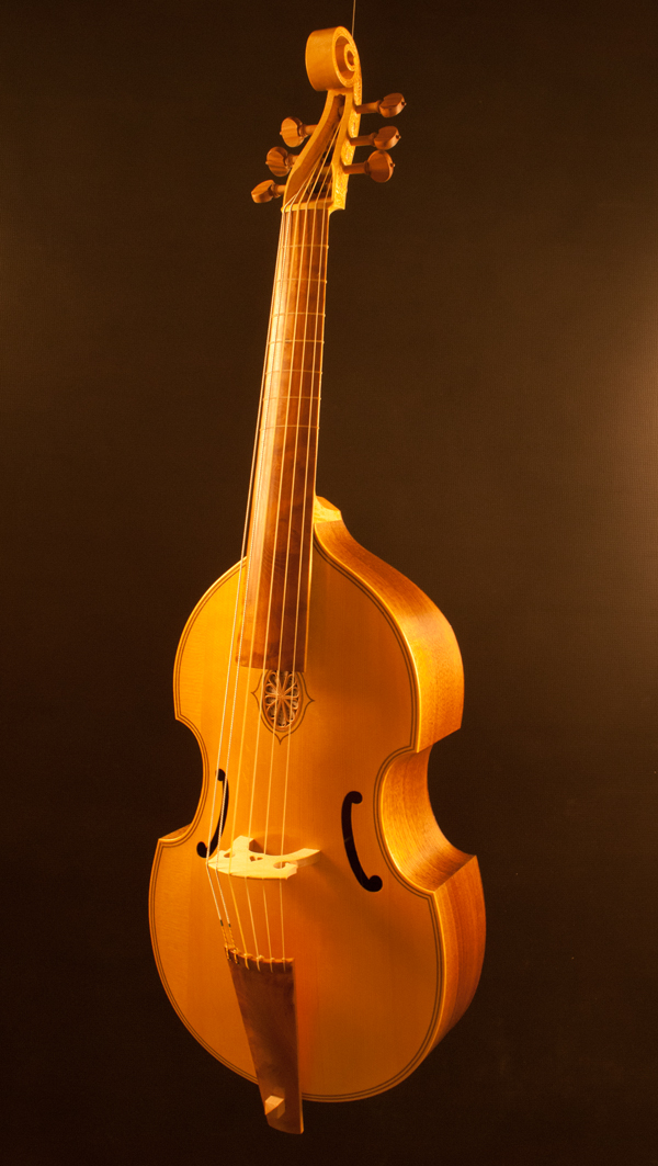 Six string bass viol after Henry Jaye 1624 A small bodied bass (62.5cm) with a string length of 67 – 69cm and made with a seven piece bent front.